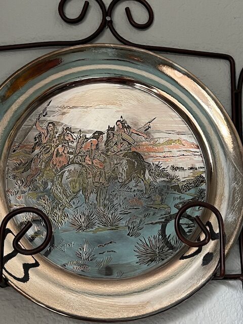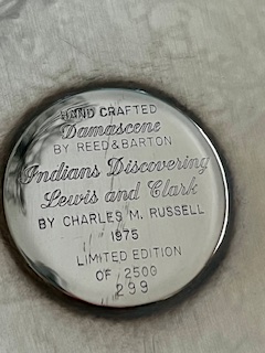Hand Crafted sterling silver Damascene plates by Reed & Barton, Lewis & Clark by Charles Russell – each plate ltd edition, 11″ diameter #299/2500 1975. titled: Indian Discover, The Outpost, Free Trappers, Toll Collector